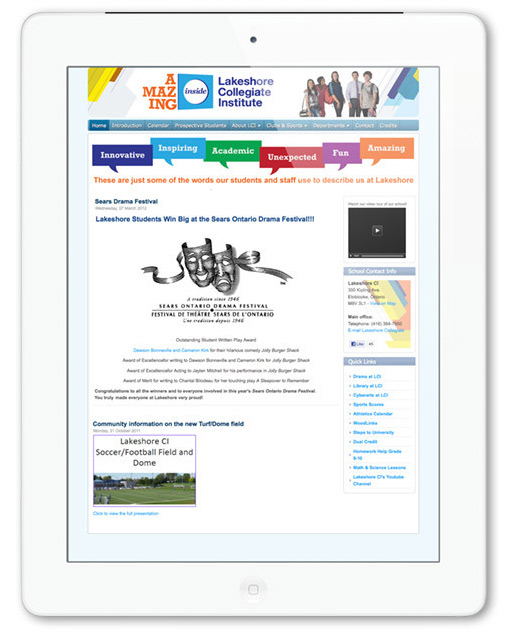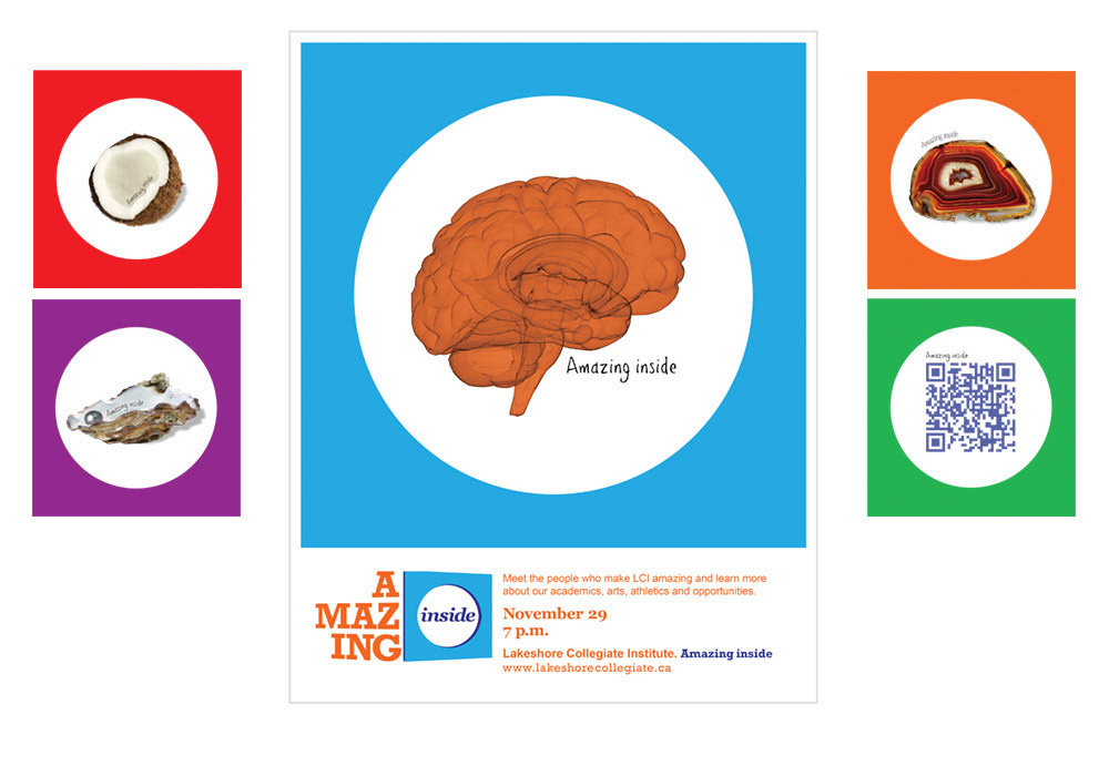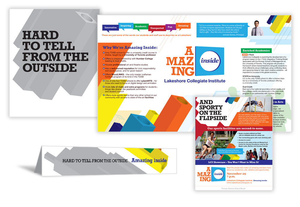 Solution: Rebrand the school as the fun, future forward education centre that it is… on the inside. The logo (the square with the die cut circle) was inspired by a very large sculpture that sits outside the main doors and is a call back to the days when the school focused on trades. The logo was used as a consistent element throughout the campaign in various incarnations–sometimes extruded, brightly coloured, and sometimes acting as a 2-dimensional frame. The school loved the campaign and even painted their concrete sculpture a vibrant blue to coincide with the new branding they received. As a result of the campaign, the school saw a boost in enrolment and 300% increase in web traffic.