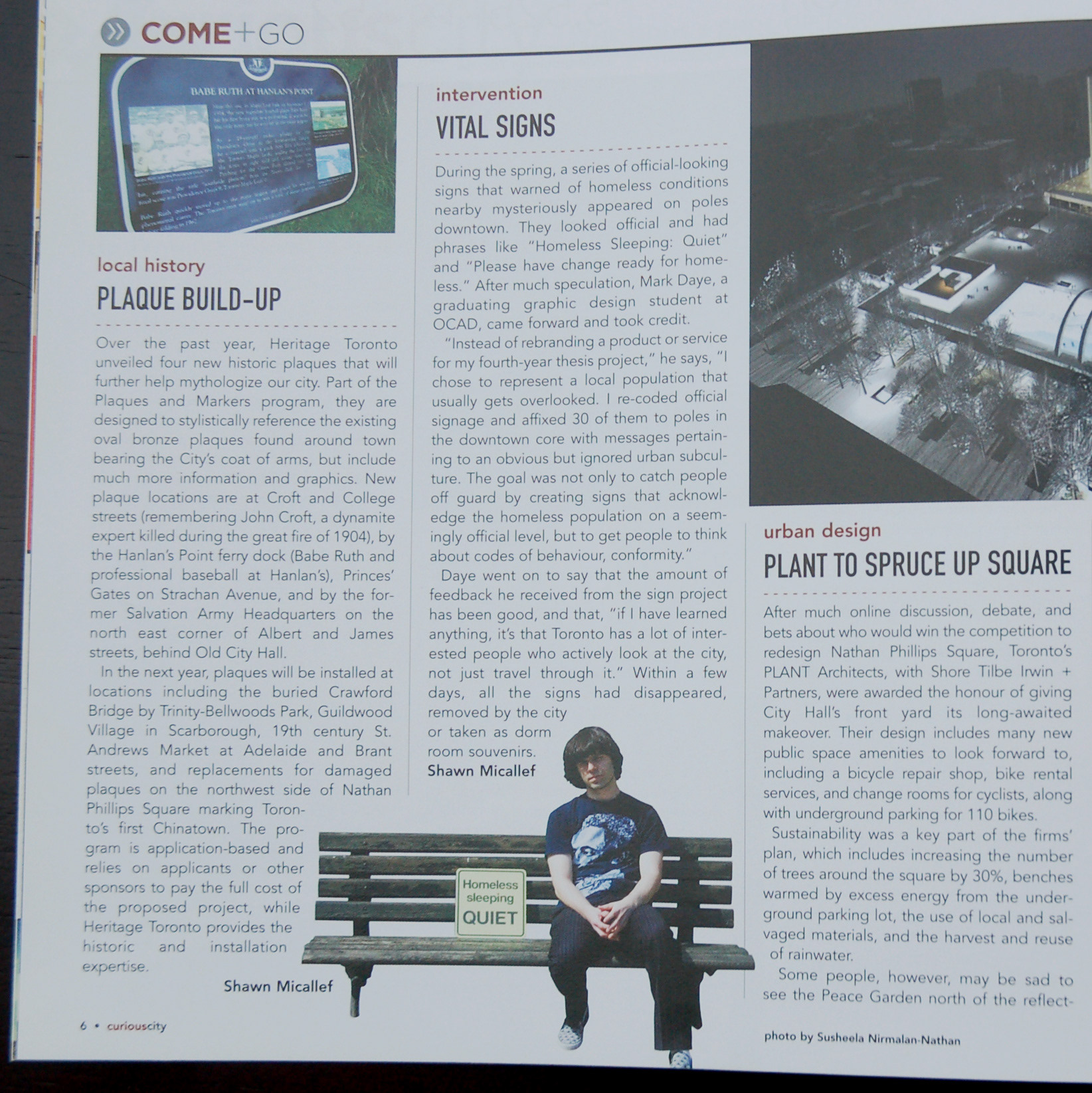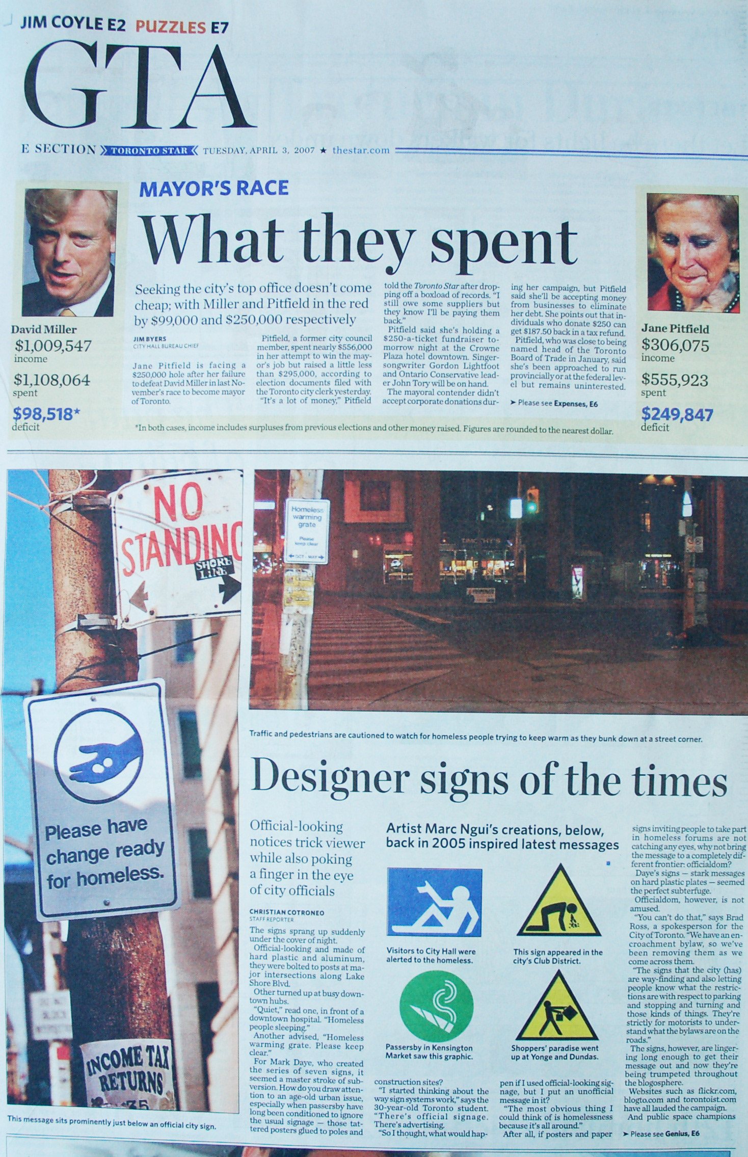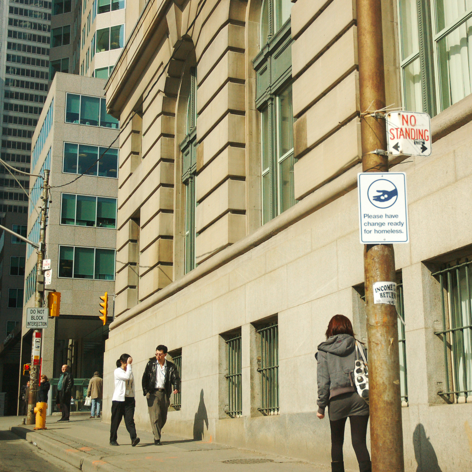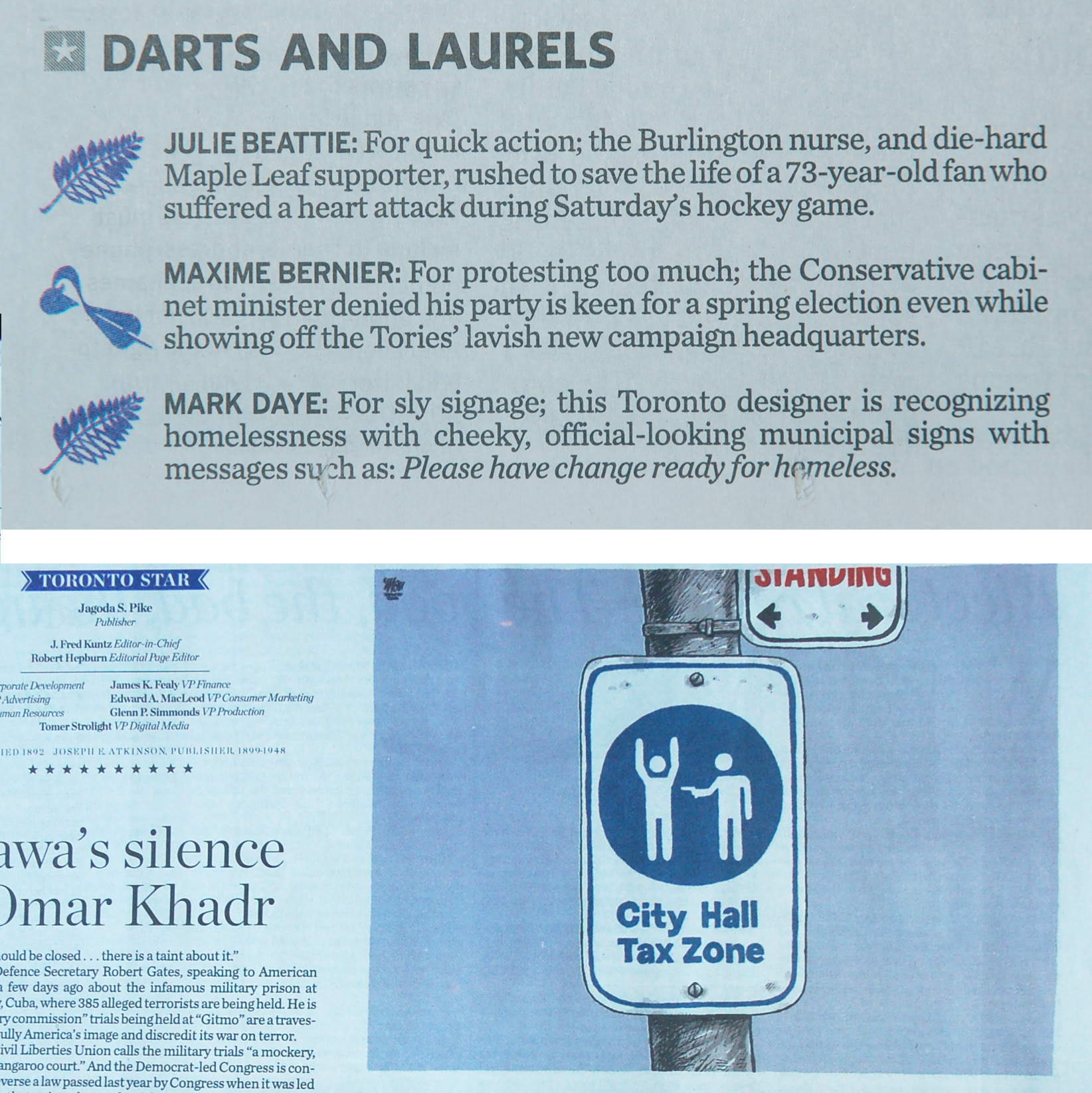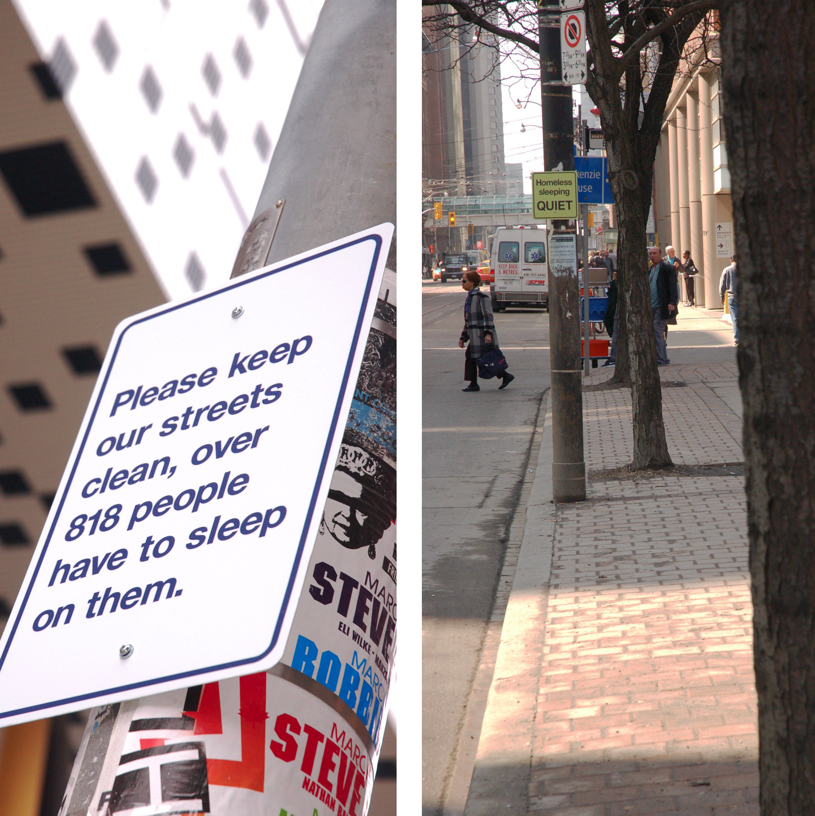 Being new to the city, I noticed there is a dynamic between the homeless and everyone else. The homeless make themselves as visible as possible and everyone else does their best to carry on around them. I wanted to interrupt that system. I chose to hijack the official language of the city – street signs – with messages about homelessness to get people to accidentally break their dissonance. It was a way to acknowledge something that the city knows and tolerates, but never discusses. The signs were a way of saying put up or shut up, or at the very least – Gotcha! Made you look.