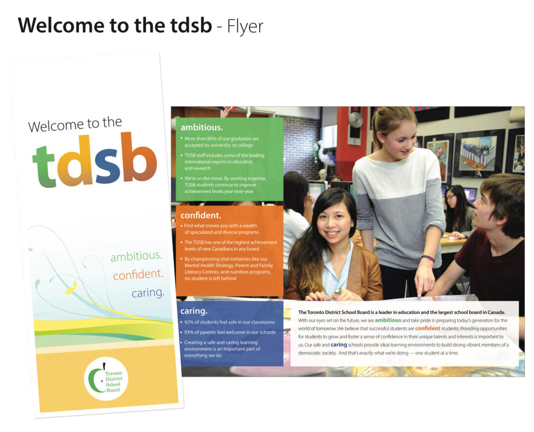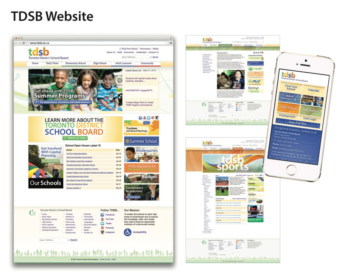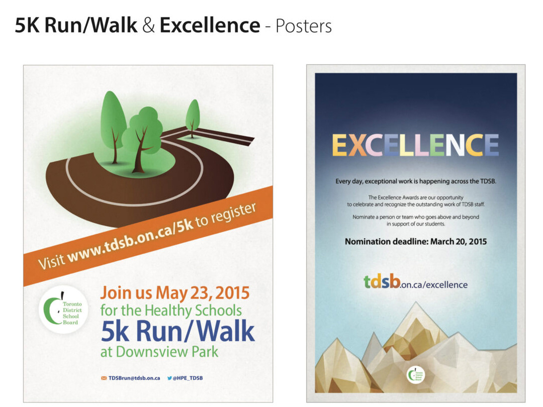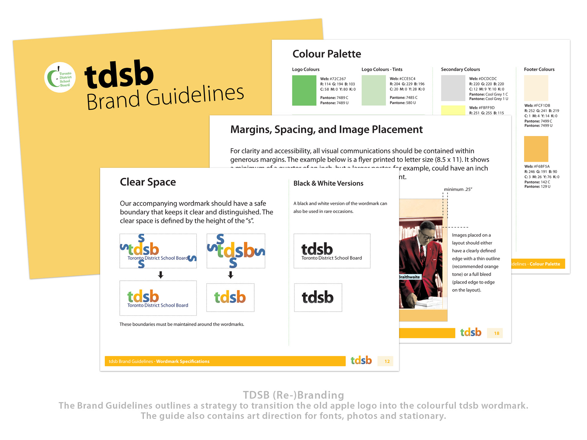 The Toronto District School Board is the largest in Canada, and 4th largest in North America. The only branding they had was a pool table green apple slice that was crowdsourced from a student a few decades ago. Out of necessity I created a wordmark from the board’s often used acronym and assigned youthful colours to each letter. I followed through with a complete brand guideline book, assets, and various versions of the logo. I championed the branding and advocated for it to the director of Education. She agreed with me and the branding was filtered down throughout the entire system.