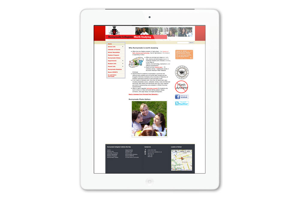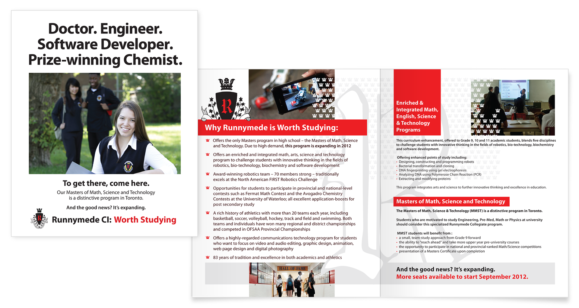 This secondary school was experiencing a population decline and needed to boost their grade 9 enrolment. The strategy was to highlight the prestigious nature of this school. Luckily, they were one of the few public schools at the board that has a school uniform, so I asked them to dig through their archives and find me a copy of their crest. Once I had the crest, I recreated it using Adobe Illustrator and used it as a design element to work through all of their material. I art directed several photographers to capture very specific photographs. I then created flyers, pamphlets, bookmarks and postcards to be distributed to all the feeder elementary schools. There were also large vinyl banners printed and hung around the school. The result saw an additional 240 students enrol that fall.